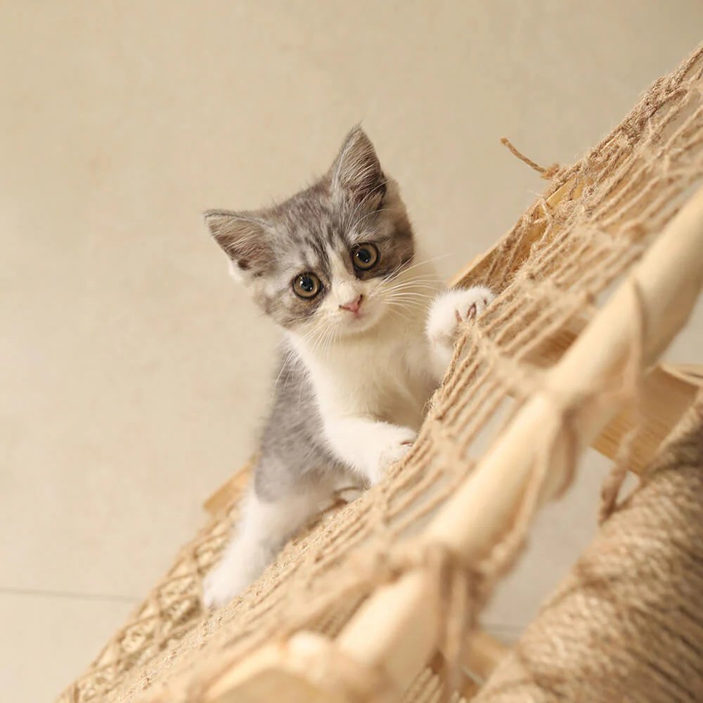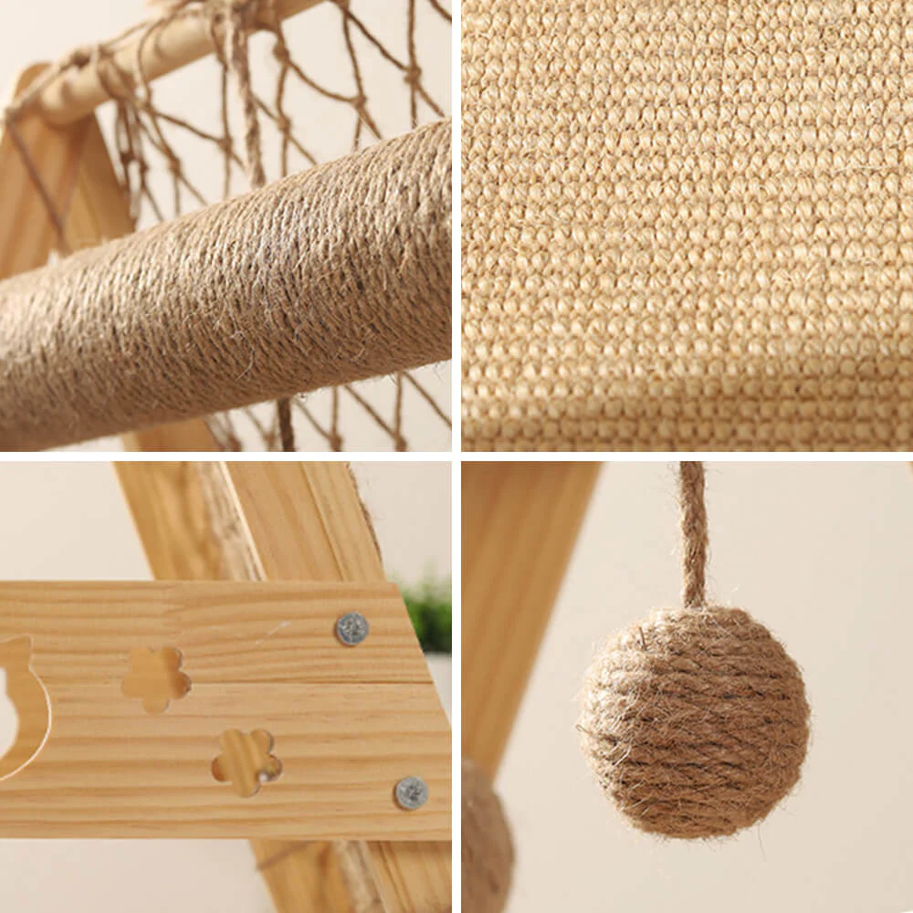Modern Wooden Cat Tree Funny Scratching Post with Hammock Climbing Net